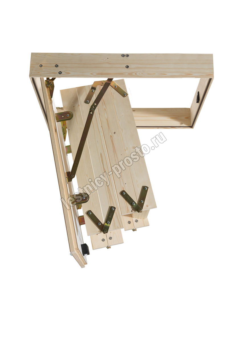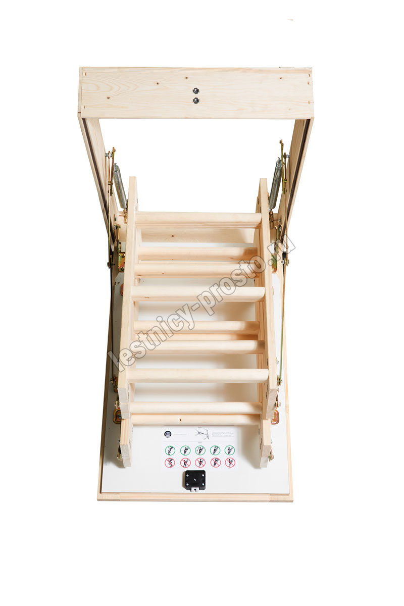 Четырехсекционная складная лестница из ели. Высоту лестницы можно увеличить с помощью дополнительной секции до 3300 мм. Лестница подходит для самостоятельного монтажа. На ступенях лестницы антискользящие насечки. Люк с двух сторон облицован ДСП белого цвета.