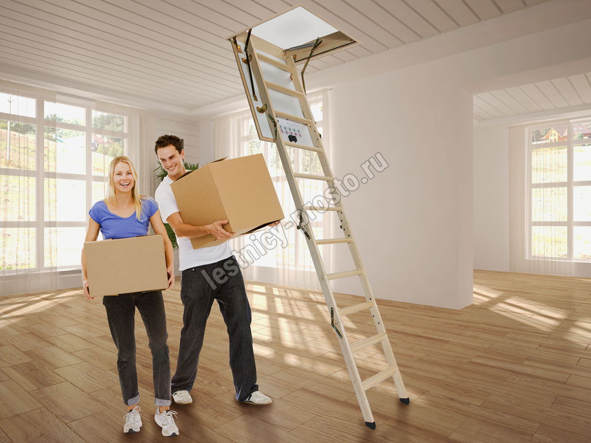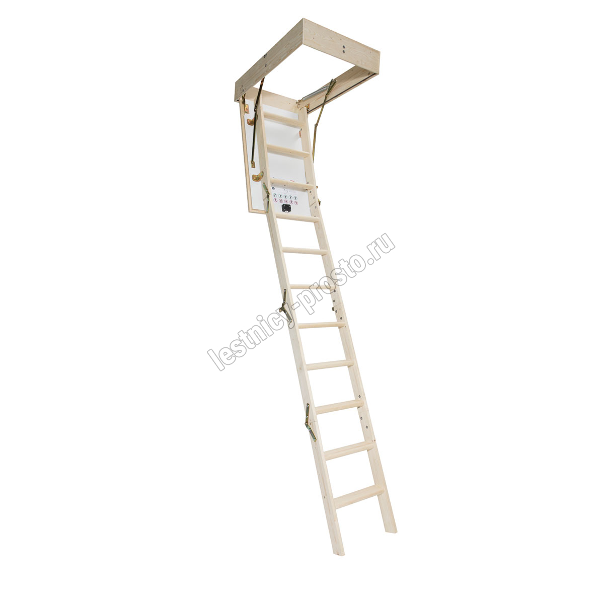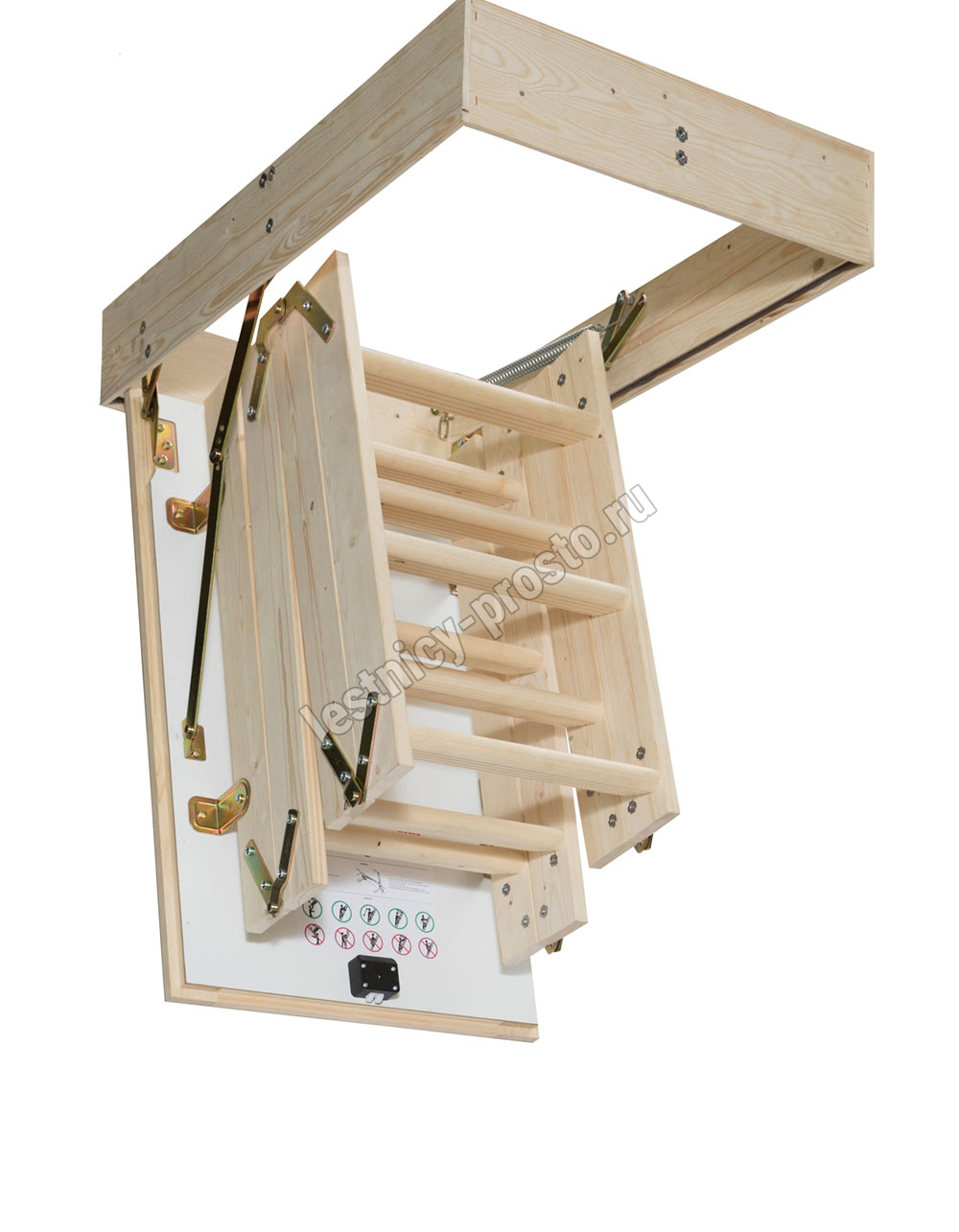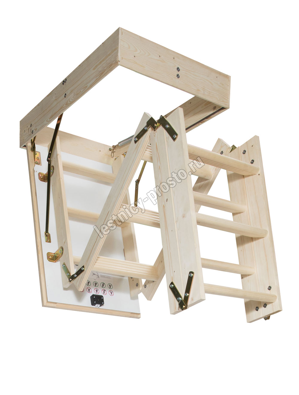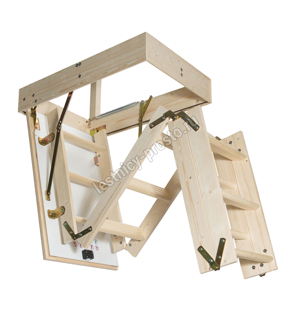 В комплекте: люк из сэндвич-панели, пружинный механизм "короб-рычаг", короб, четырехсекционная лестница с буковыми ступенями, замок люка, штанга для раскладывания лестницы, наконечники для ножек