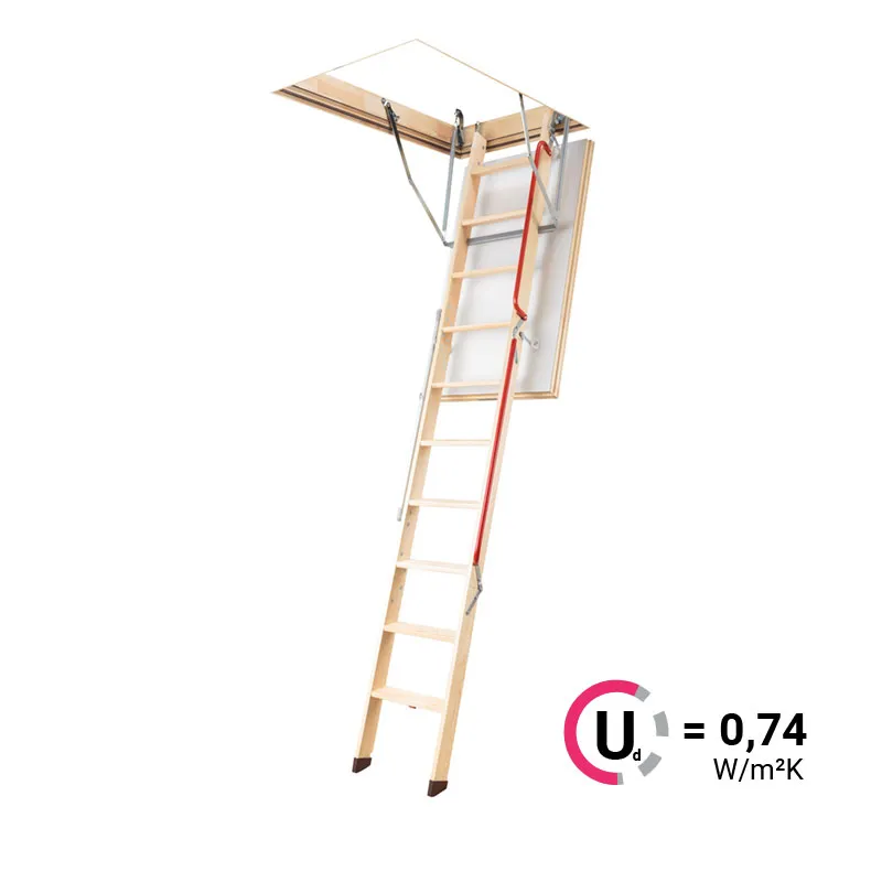 Чердачная лестница LTK Thermo изготовлена из сосны высшего качества и укомплектована утепленной крышкой люка толщиной 66 мм с повышенными теплоизоляционными свойствами. Данную модель лестницы можно использовать даже в домах, где значительна разница температур между этажами, и тем самым ограничить проникновение холода в жилые помещения. Лестница состоит из трех секций, которые компактно складываются и «хранятся в потолке». Крышка люка облицована ДВП белого цвета, что делает ее практически незаметной при установке в светлом или белом потолке. Для большего удобства и безопасности эксплуатации лестница Thermo оснащена боковым металлическим поручнем, а пластиковые наконечники предохраняют поверхность пола от повреждения и увеличивают устойчивость конструкции