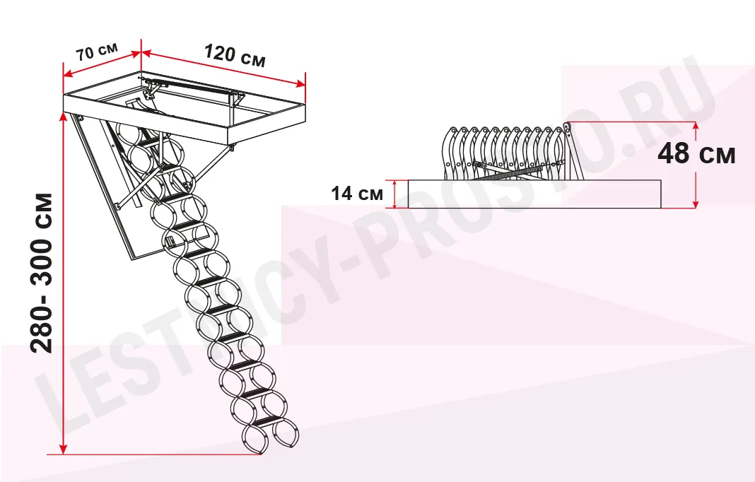 Благодаря «ножничной» системе складывания в сложенном виде лестница LSF очень компактна, и соответственно имеет небольшой размер крышки люка. Специальный механизм регулировки угла открывания крышки люка позволяет подогнать высоту лестницы под высоту потолка.