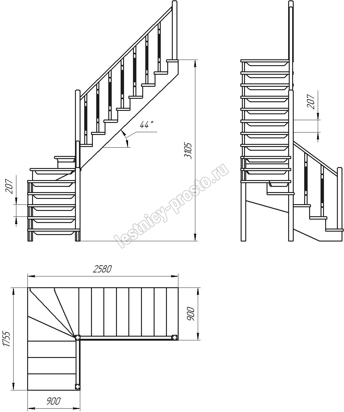 Деревянная межэтажная лестница ЛЕС-09 3105 проем 2580-900, Бук