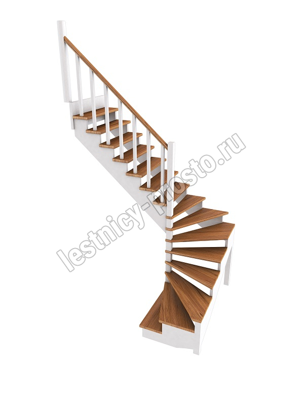 Ступени и поручень лестницы изготовлены из сращенного дуба; тетивы, столбы, балясины - из сосны. Возможно изготовление данной модели полностью из дуба. Базовый комплект включает в себя деревянные элементы лестницы и ограждения без какого-либо покрытия.