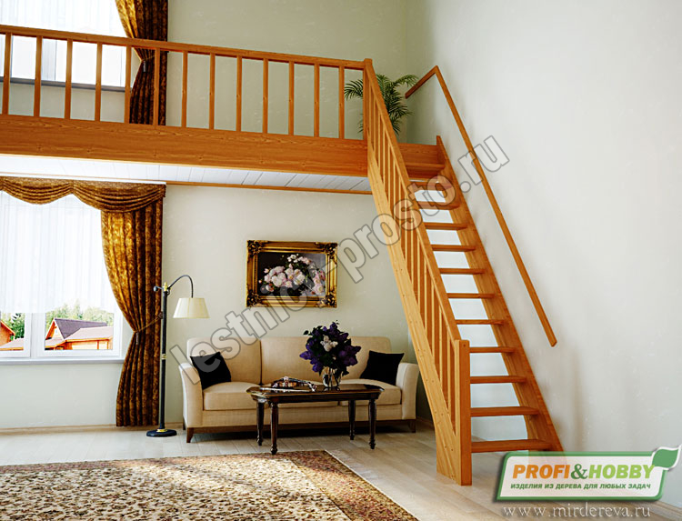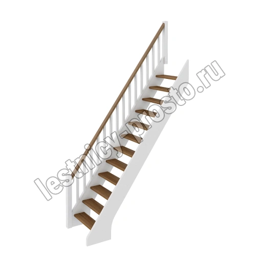 В производстве лестницы ЛС-10м под покраску используется сосна с небольшими изменениями цвета, что практически не влияет на ее механические свойства и почти незаметно при покраске в темные цвета. Базовый комплект включает в себя деревянные элементы лестницы и ограждения без какого-либо покрытия. Ограждение можно установить слева или справа.