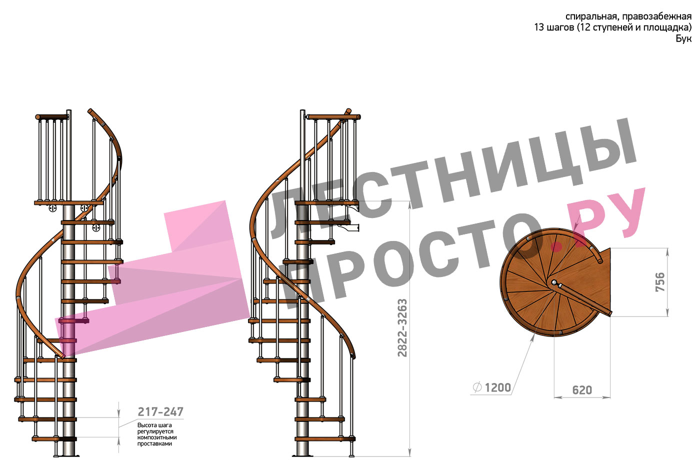 Решение о направлении поворота принимается при сборке лестницы - универсальная конструкция позволяет собрать правозабежную и левозабежную лестницы. Высота ступеней регулируется с шагом 3 мм. в пределах 217-247 мм., благодаря чему, лестница прекрасно подгоняется под необходимую высоту.